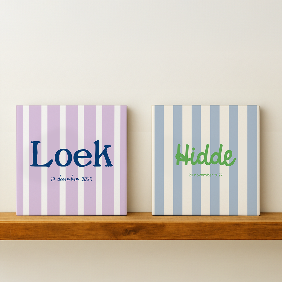 Dit kleurrijke geboorte-tegeltje is hét cadeautje dat blijft hangen, letterlijk. Met een speelse paarse achtergrond en blauwe tekst ontwerp je jouw eigen unieke tegel met de naam van de baby. Verkrijgbaar met houder of haakje, zodat het kunstwerkje meteen een mooi plekje krijgt in de babykamer.